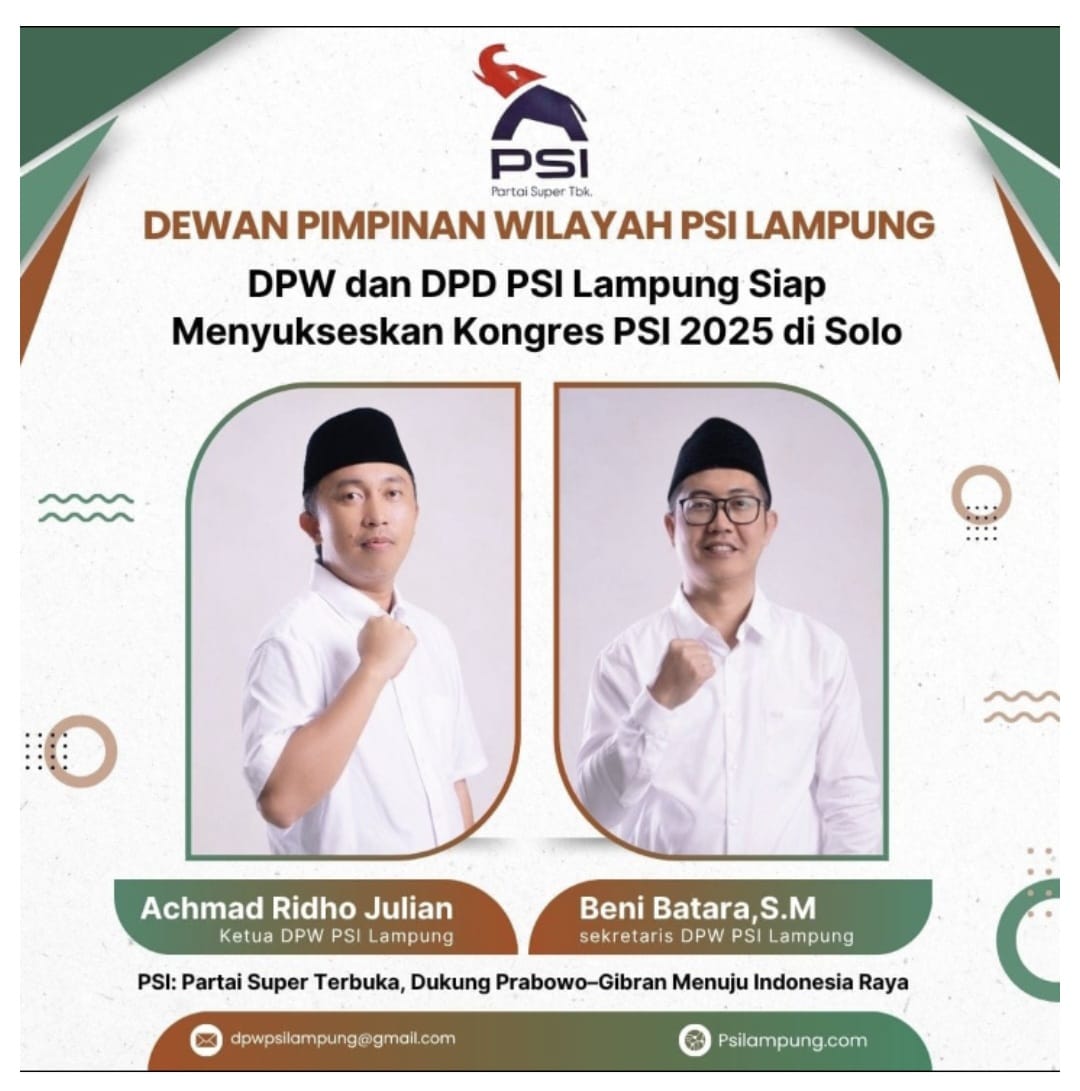 Ketua DPW PSI Lampung, Achmad Ridho Julian didampingi oleh Sekretaris Beni Batara, S.M menegaskan bahwa seluruh kader PSI dari Provinsi Lampung datang dengan semangat penuh untuk menyuarakan visi perubahan dan menyongsong arah politik baru yang lebih progresif dan mendukung penuh Kaesang Pangarep sebagai calon Ketua Umum. Dalam pernyataannya, Bro Ridho menyampaikan: