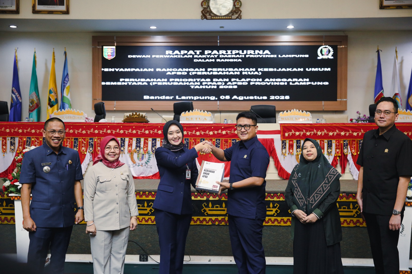 Bandar Lampung, Harianduta.com-Pemerintah Provinsi Lampung menyerahkan dokumen Rancangan Perubahan Kebijakan Umum APBD dan Prioritas Plafon Anggaran Sementara (KUA-PPAS) Tahun 2025, serta Rancangan KUA-PPAS Tahun 2026, kepada DPRD Provinsi Lampung.