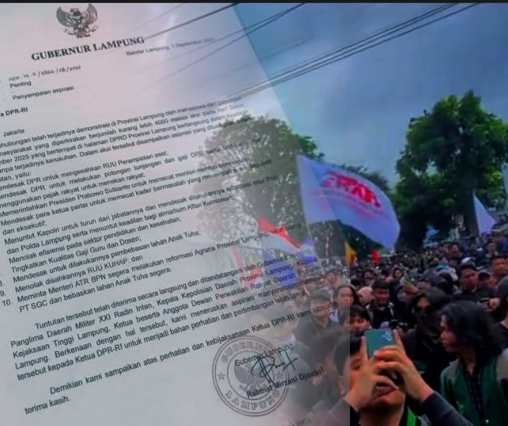 Bandar Lampung, Harianduta.com- Respon cepat Gubernur Lampung, Ahmad Mirzani Djausal dalam menyikapi aksi massa 1 September 2025 dengan menindaklanjuti 10 tuntutan rakyat ke pemerintah pusat mendapat apresiasi luas dari berbagai kalangan masyarakat.