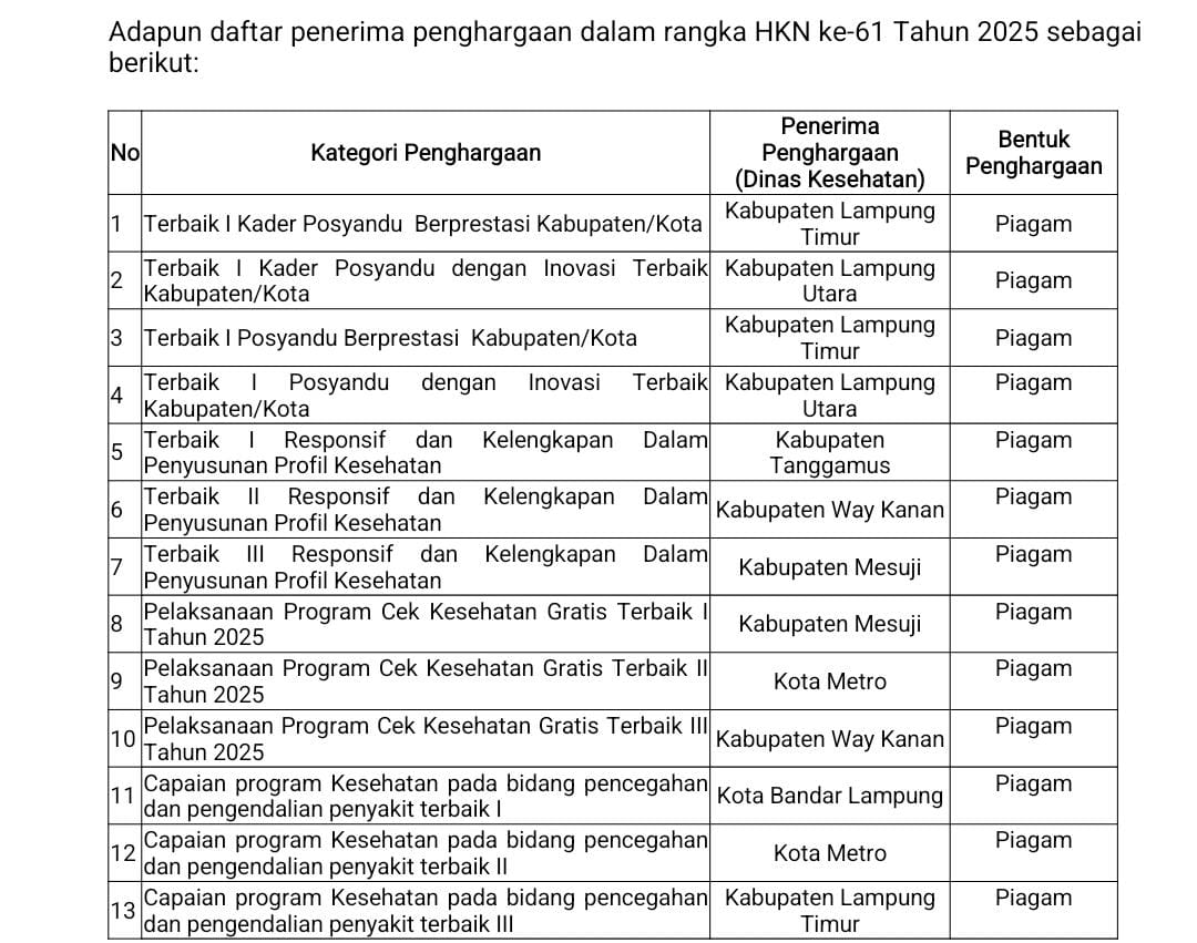 Dengan semangat “Generasi Sehat, Masa Depan Hebat,” Pemerintah Provinsi Lampung berkomitmen untuk terus mendukung transformasi sistem kesehatan nasional menuju Lampung Sehat, Indonesia Hebat, dan Indonesia Emas 2045.