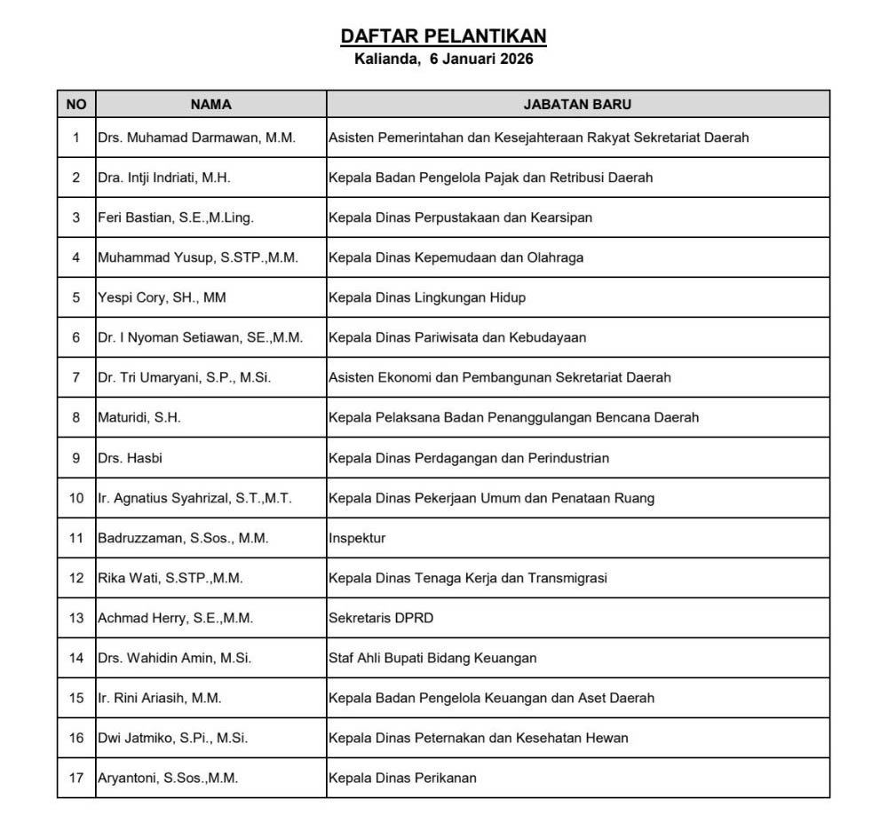 Pelantikan ini merupakan bagian dari rangkaian penataan dan pengisian jabatan hasil uji kompetensi pejabat pimpinan tinggi pratama yang telah dilaksanakan sebelumnya.