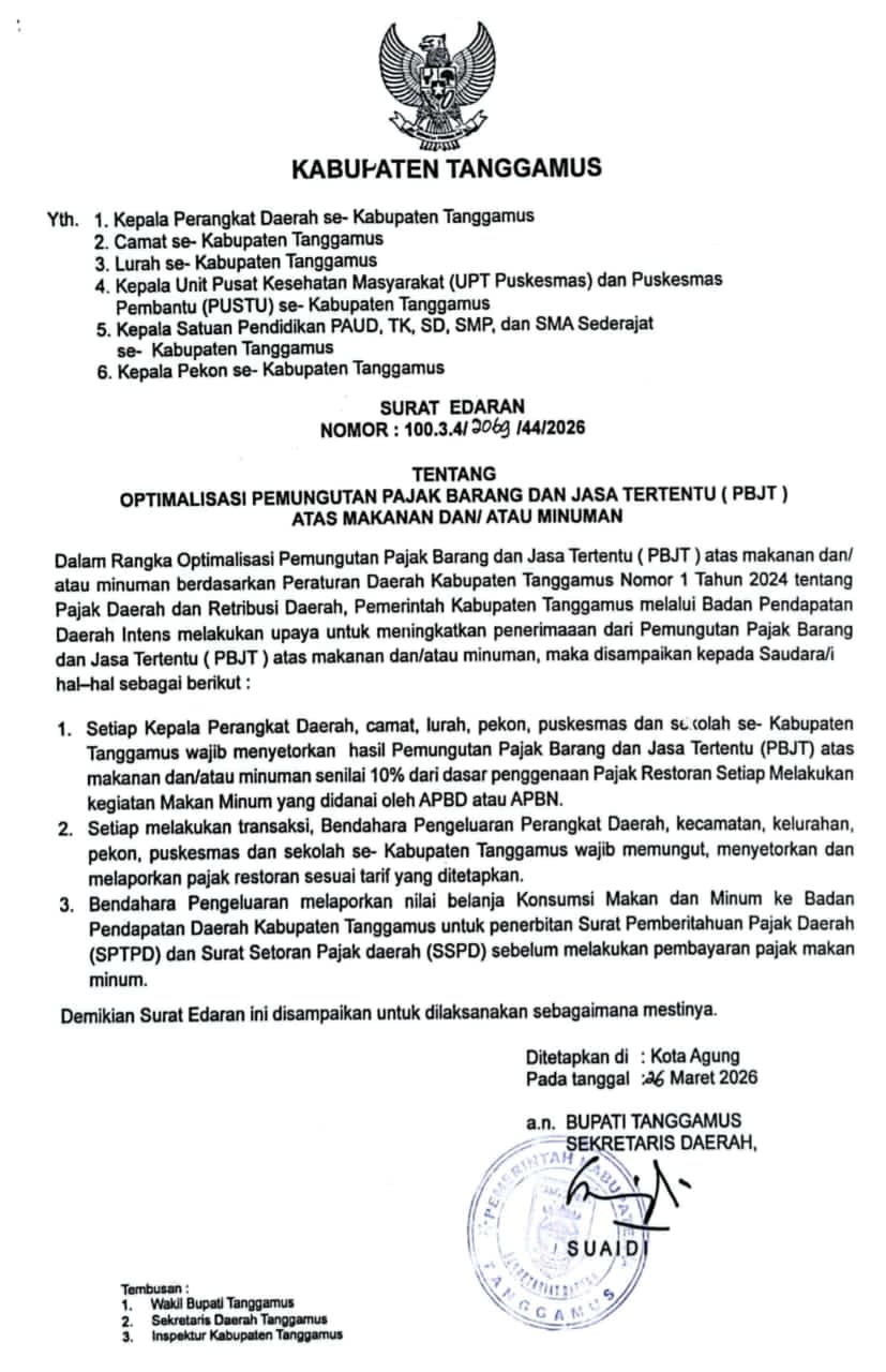 Surat edaran tersebut ditetapkan di Kota Agung pada 26 Maret 2026 dan ditandatangani oleh Sekretaris Daerah Tanggamus, Suadi, atas nama Bupati Tanggamus.