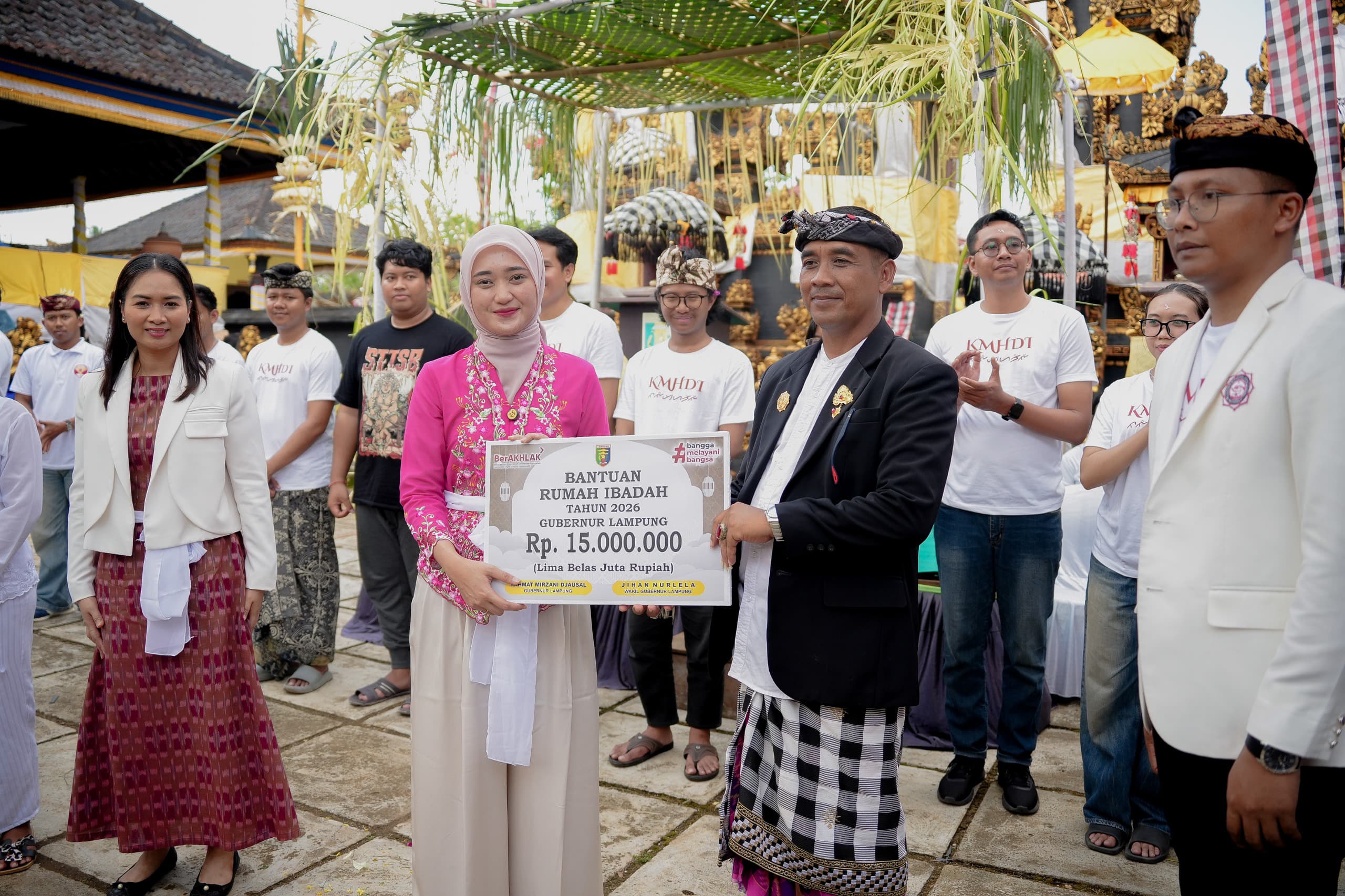 LAMPUNG TIMUR — Wakil Gubernur Lampung Jihan Nurlela menghadiri kegiatan Mahasabha (Kongres Nasional) XIV Kesatuan Mahasiswa Hindu Dharma Indonesia (KMHDI) yang digelar di Pura Dalem, Desa Sidorejo, Kabupaten Lampung Timur, Jumat (3/4/2026).